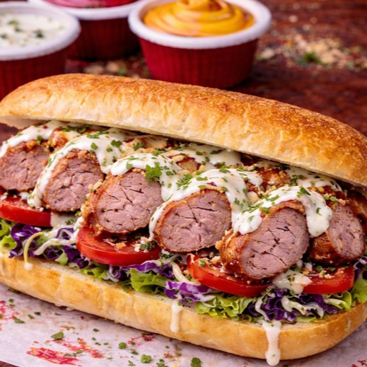 Pan artesanal con lomo de cerdo, chimichurri argentino, repollo morado, lechuga fresca y salsa ranch.