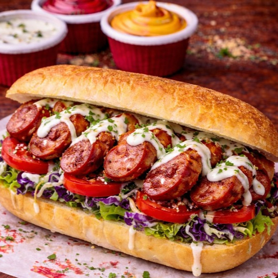 Pan artesanal a la parrilla con chorizo al chimichurri argentino, repollo morado, lechuga, tomate y salsa ranch.
