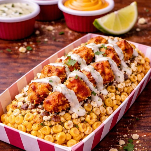 Maíz tierno grill sellado a la parrilla con trozos de pollo tender y salsa ranch de la casa.