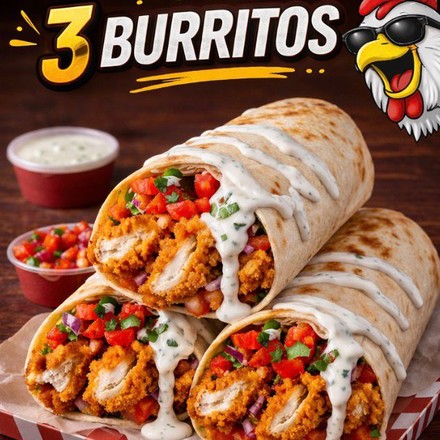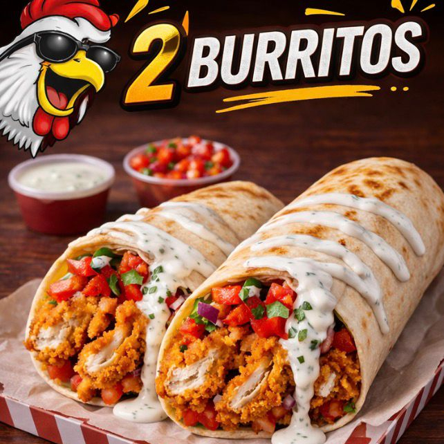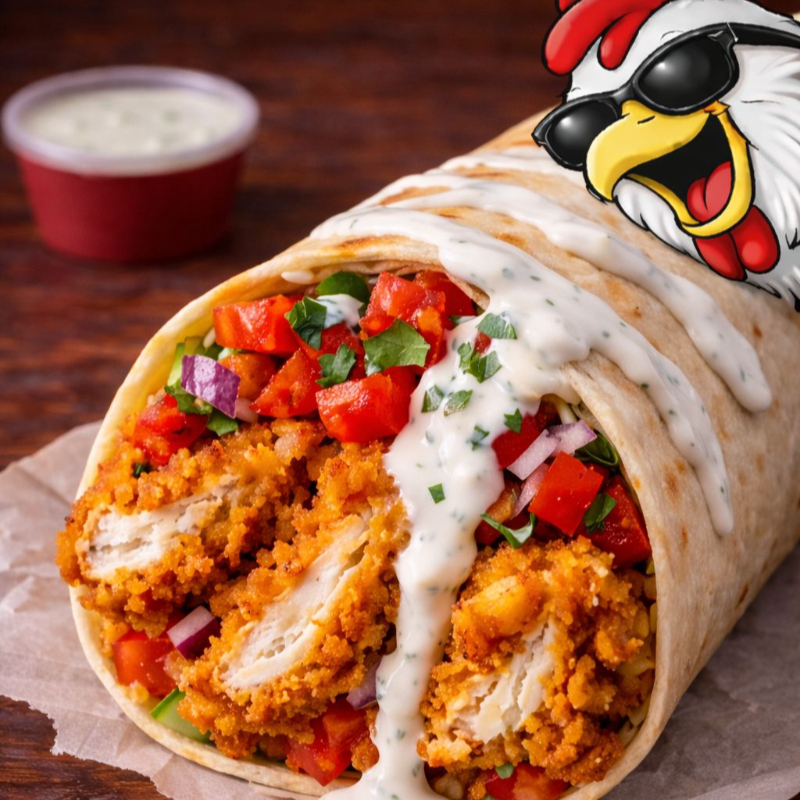 2 DELICIOSAS TORTILLAS DORADAS A LA PARRILLA, RELLENOS DE TROZOS DE POLLO TENDER, SALSA RANCH, LECHUGA Y SALSA SECRETA DE LA CASA, CORONADO CON CILANTRO Y LEMON PEPER
