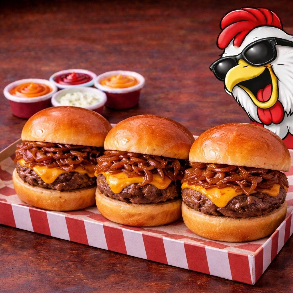 3 MINI HAMBURGUESAS, REALIZADAS CON PAN SELLADO CON MANTEQUILLA EN LA PARRILLA, RELLENAS CON LECHGA Y REPOLLO MORADO HECHOS EN MAYONESA, ACOMPAÑADOS DE CARNE DE RES, CEBOLLA CARAMELIZADA, QUESO AMERICANO