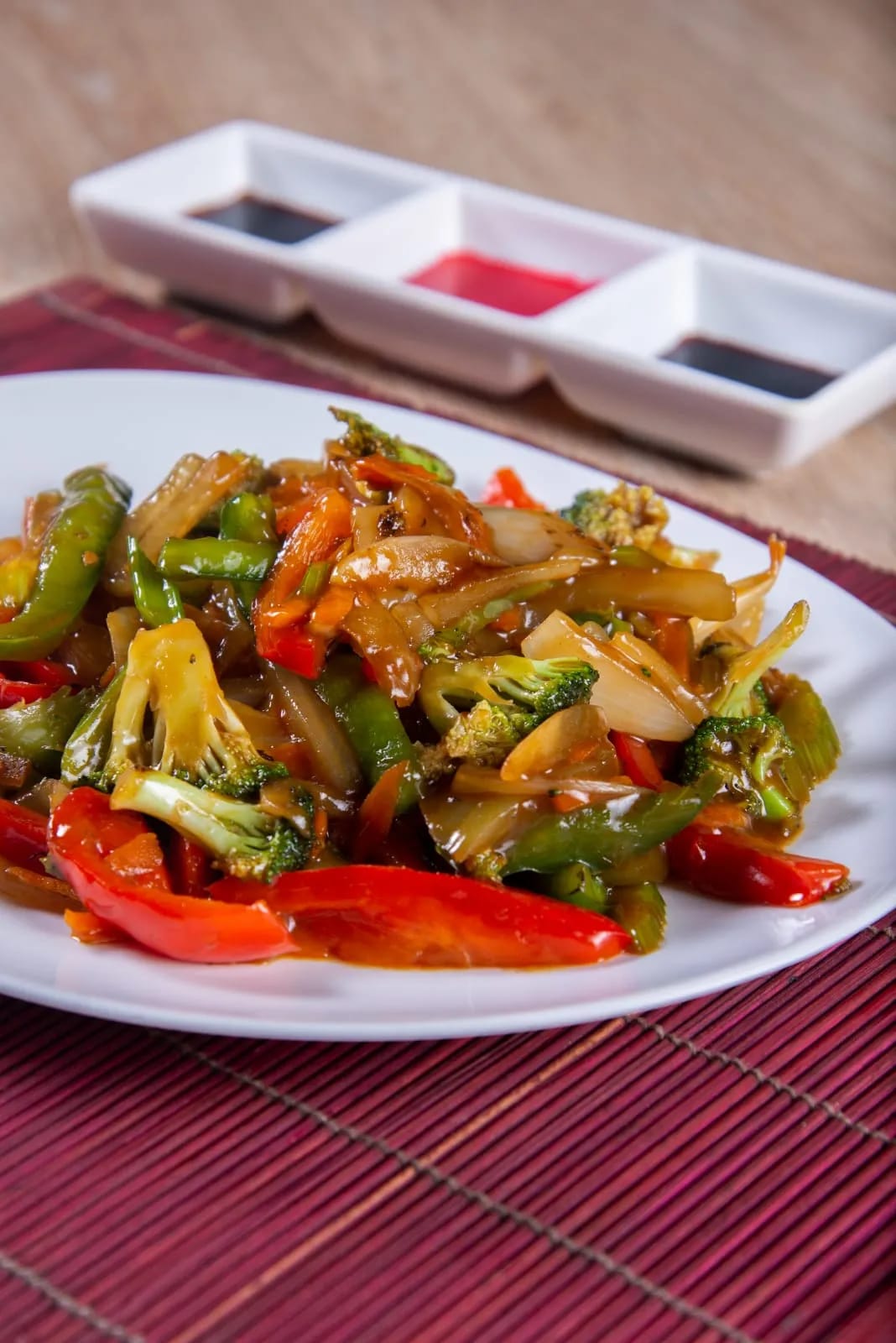Pechuga salsa BBQ, papas a la francesa y ensalada (lechuga, tomate, cebolla).