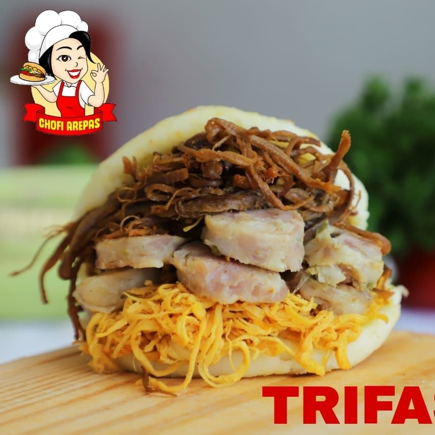 Arepa de queso, rellena con butifarra y salsas.