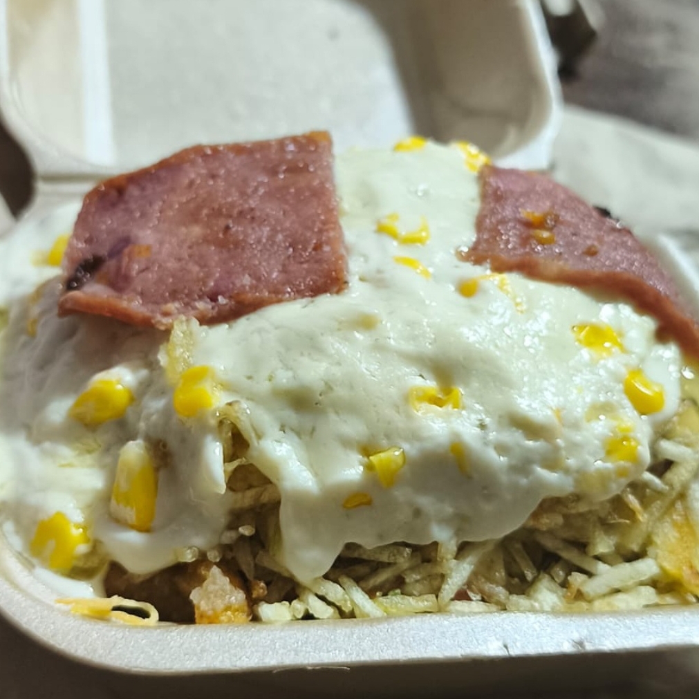 Arepa de queso picada, 4 proteinas, queso mozarella, maiz, papa chongo y tocineta.