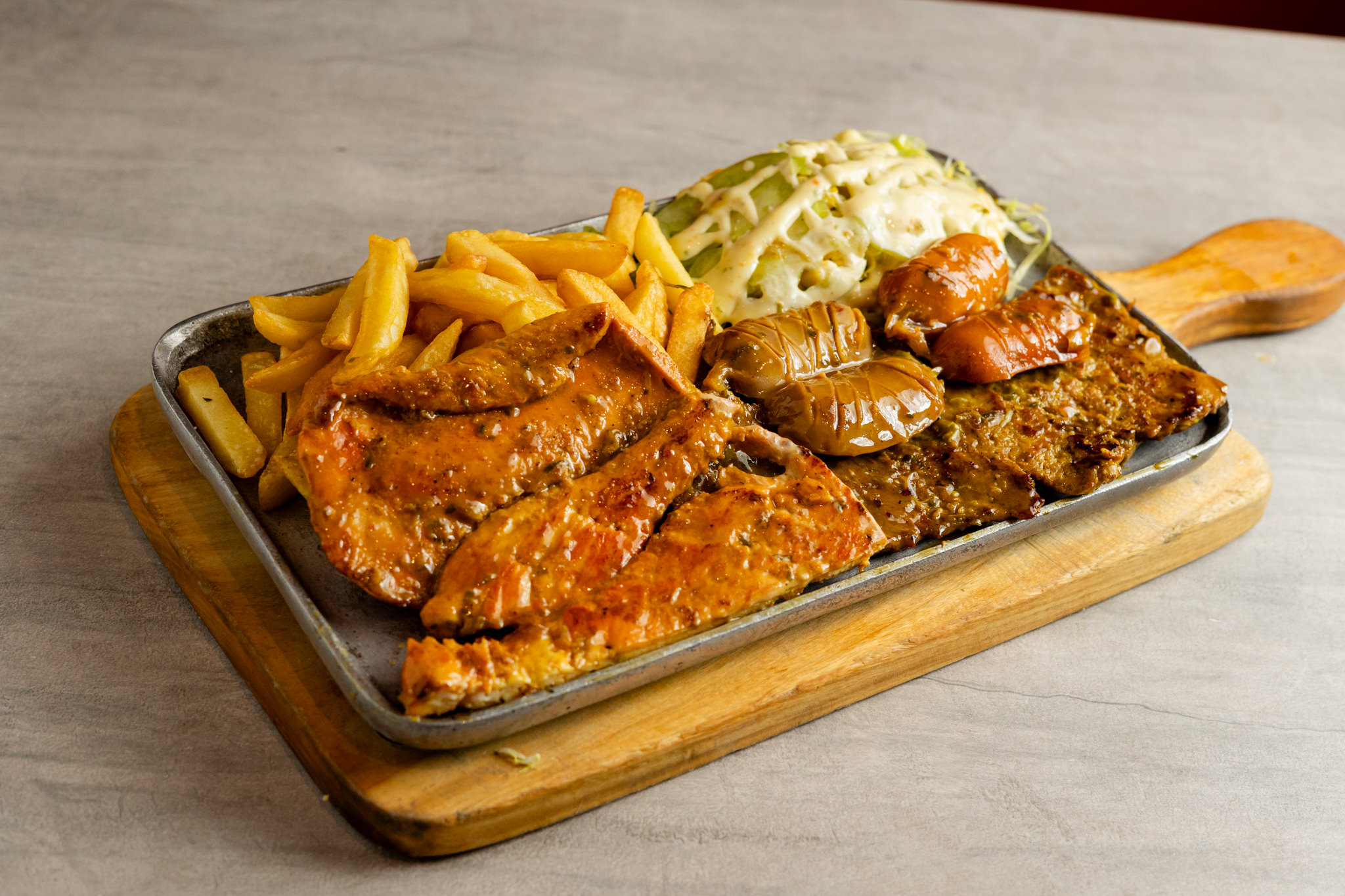 Lomo fino, pechuga, salchicha, papa francesa, queso, papita ripio, lechuga y salsa tártara.
