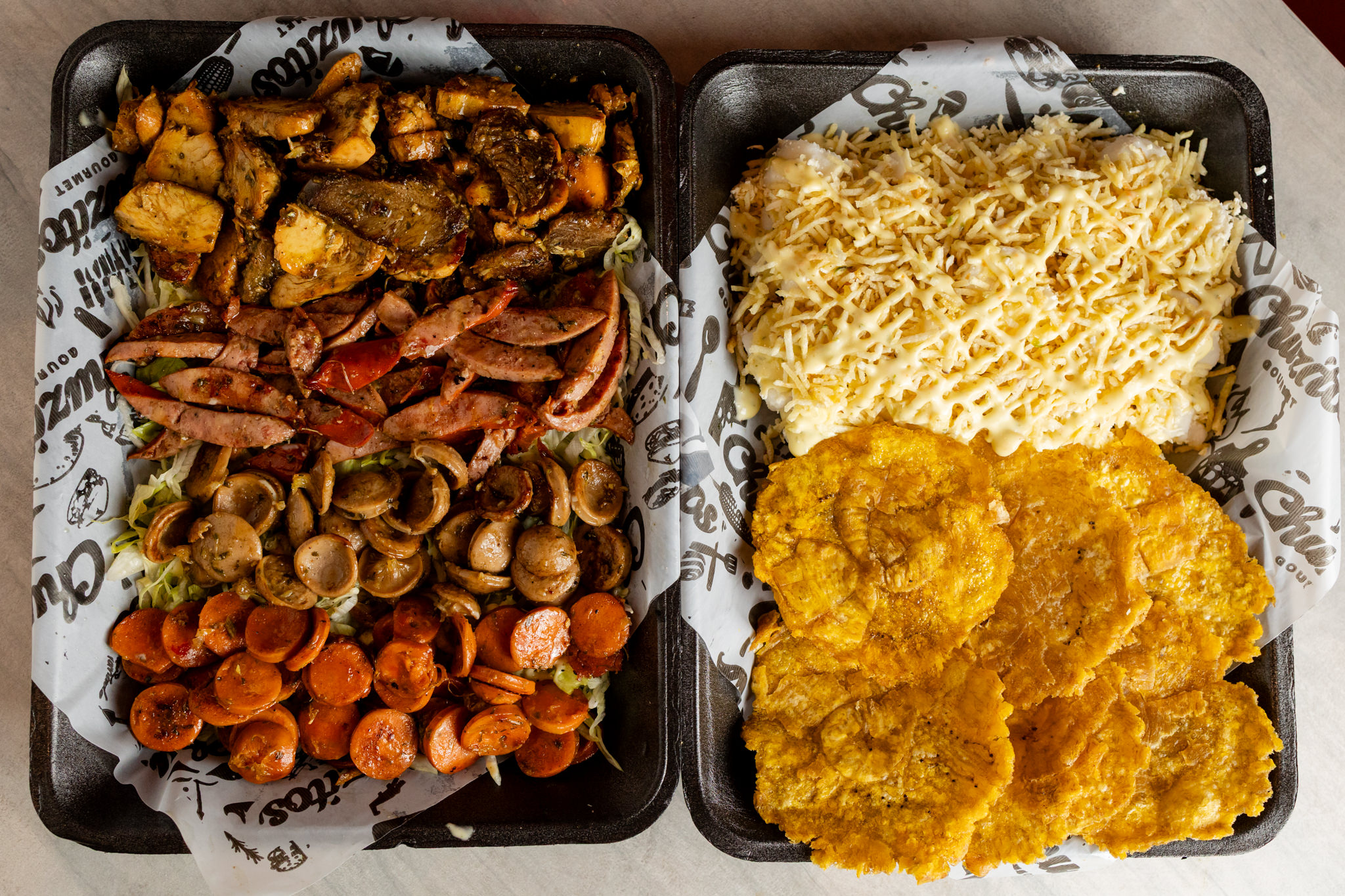 Patacon de platano, lechuga, queso costeño, papa chongo, chorizo, queso gratinado