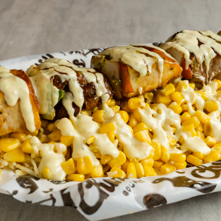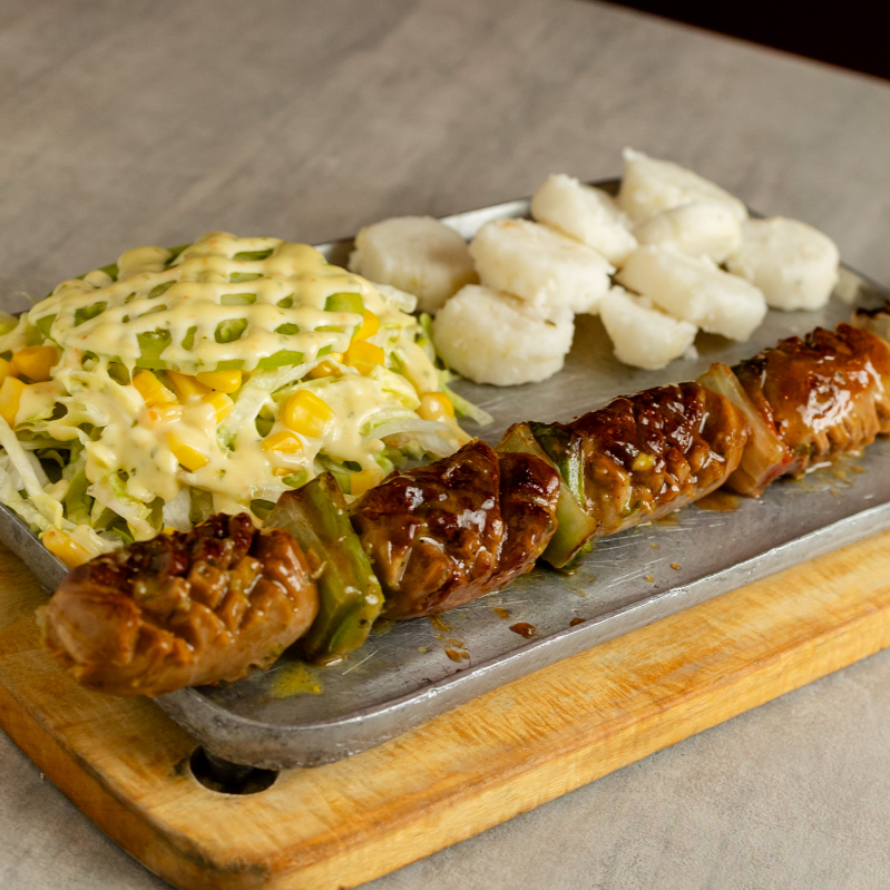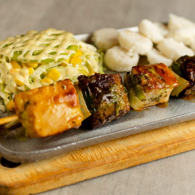 Pincho de lomito y pollo acompañado de papa chongo y queso costeño, sobre una cama de maíz dulce, decorado con pimentón y cebolla blanca.