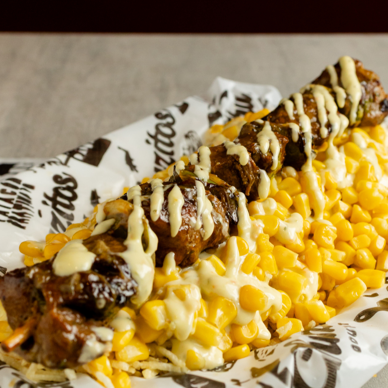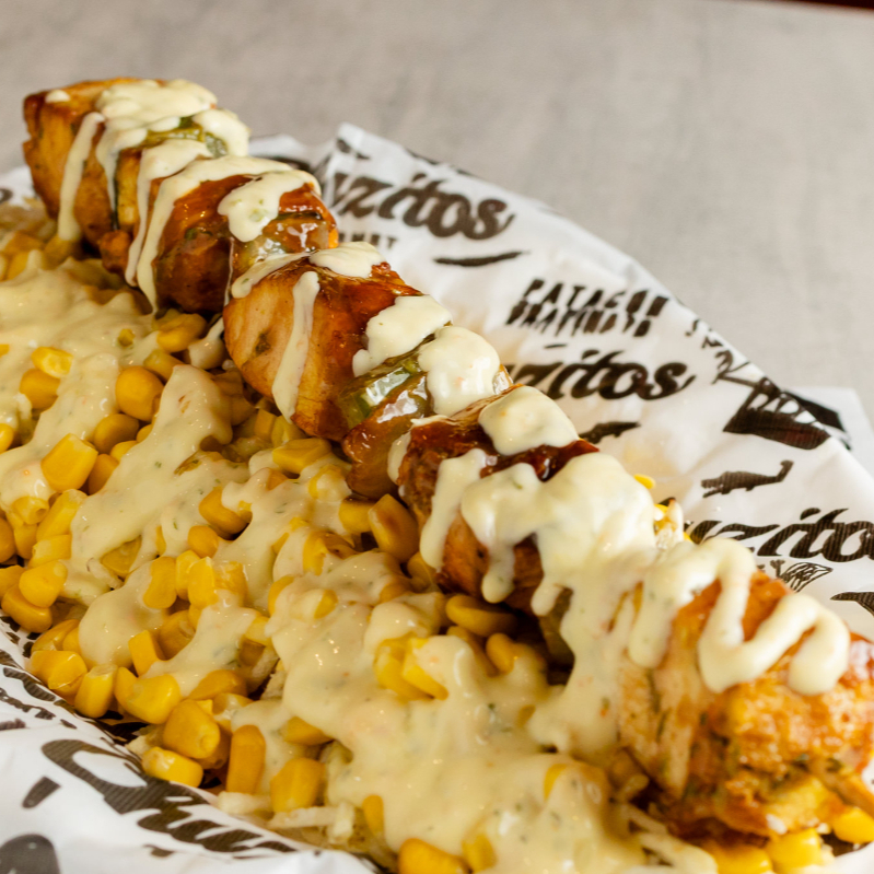 Mazorca con pollo desmenuzado, queso, papitas y salsa tártara.
