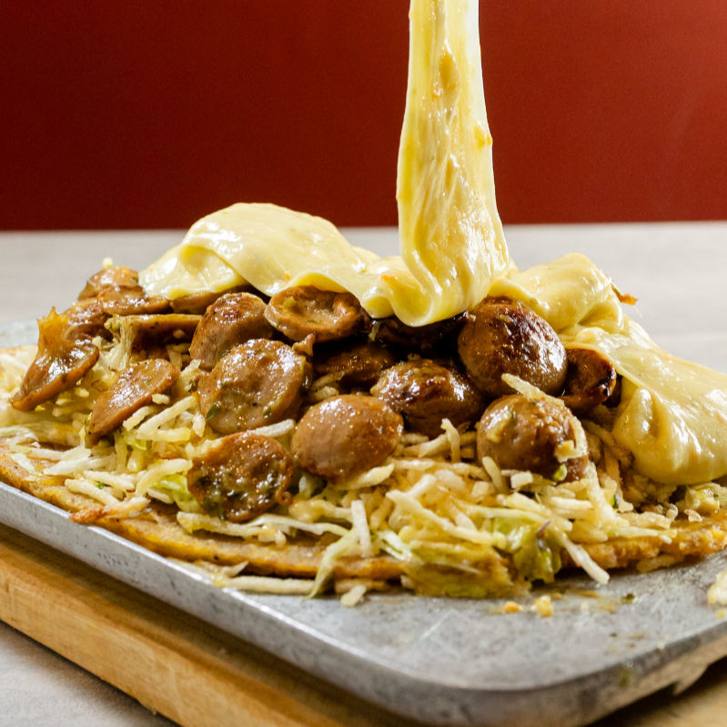 Arepa de maíz blanco, salsa de la casa, queso costeño, papa ripio, chorizo.