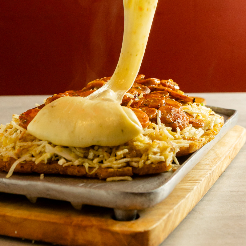 Arepa de maíz blanco, salsa de la casa, queso costeño, papa ripio, salchicha suiza.