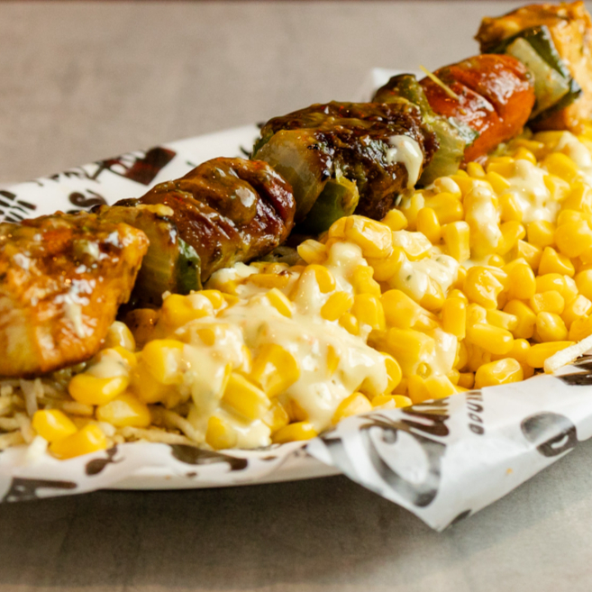 Pincho 4 carnes acompañado de papa chongo y queso costeño, sobre una cama de maíz dulce, decorado con pimentón y cebolla blanca.