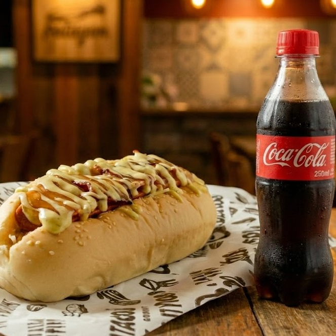 Pan, salchicha long, queso costeño, papita ripio, lechuga, salsa tártara y gel de piña.