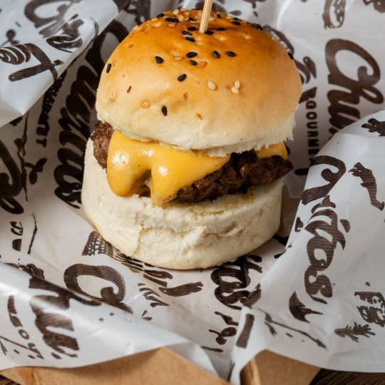 Hamburguesa de pollo con pan, queso cheedar, tocineta, lechuga y salsas.