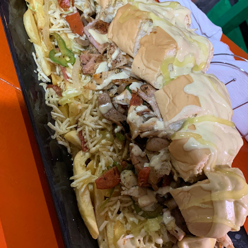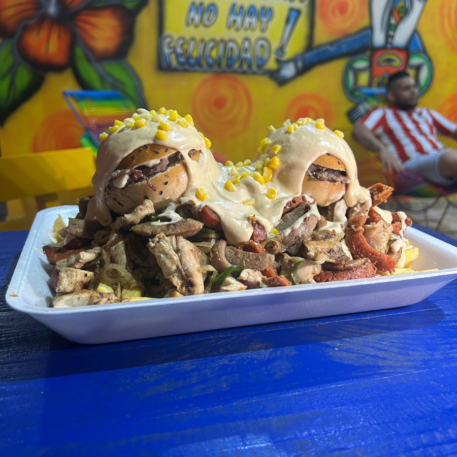 (Butifarra + Grill de Salchicha + Pollo + Papas + Queso + Maiz + Lechuga + Papitas de Perro + Salsa de Casa + Gratinado) + 2 mini hamburguesas