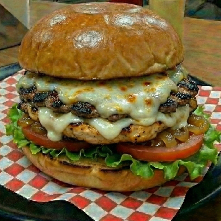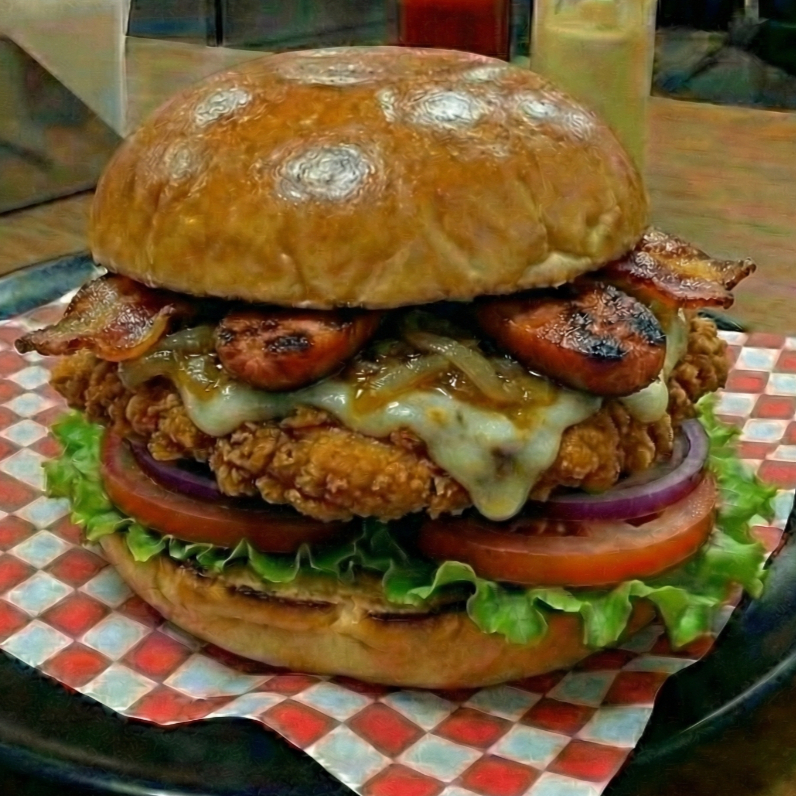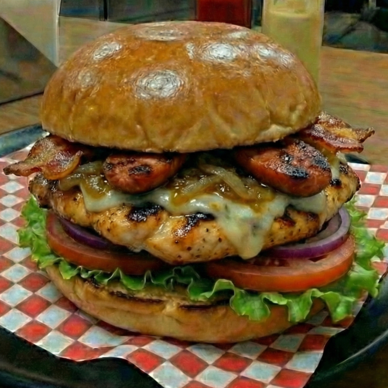 Pan de hamburguesa lechuga tomate pechuga de pollo crispy queso mozzarella cebolla caramelizada chorizo artesanal tocineta