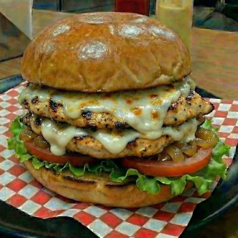Pan de hamburguesa lechuga tomate cebolla sofrita doble pechuga de pollo queso mozzarella