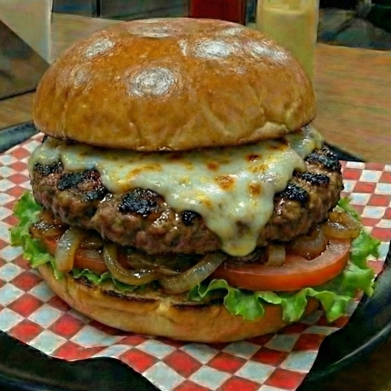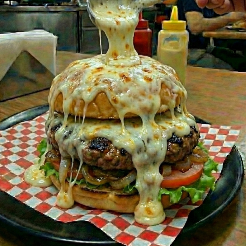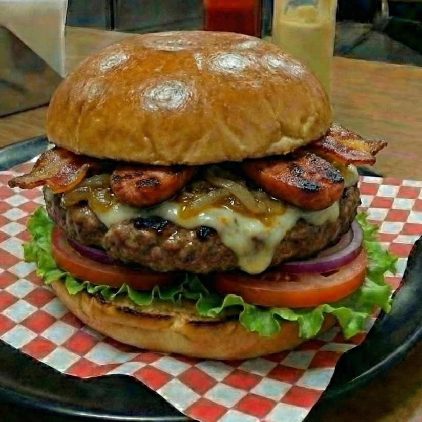 Pan de hamburguesa lechuga tomate carne angus certificada queso mozzarella cebolla caramelizada chorizo artesanal tocineta