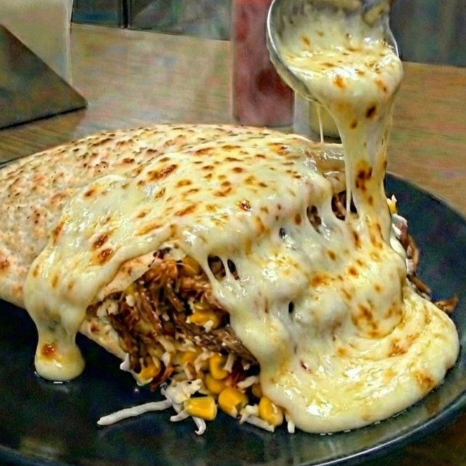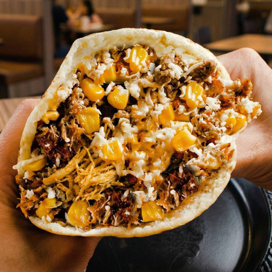 Arepa de maíz rellena de carne desmechada, pollo desmechado, queso costeño, maduritos, maíz dulce, virutas de papa