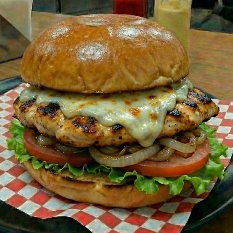 Pan de hamburguesa lechuga tomate cebolla sofrita pechuga de pollo asada queso mozzarella
