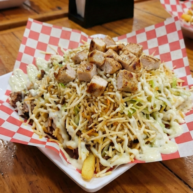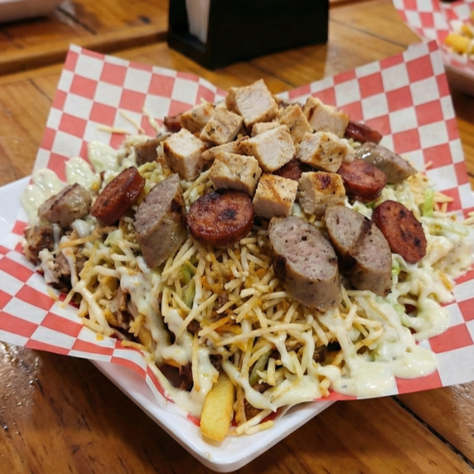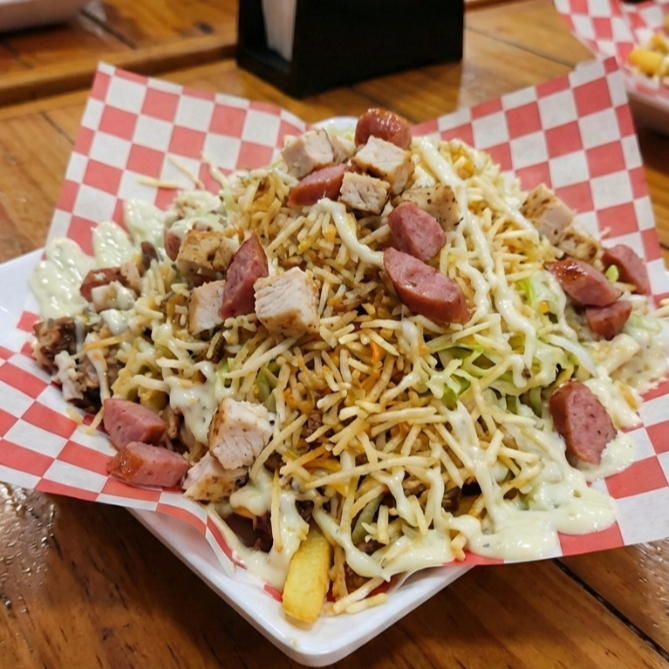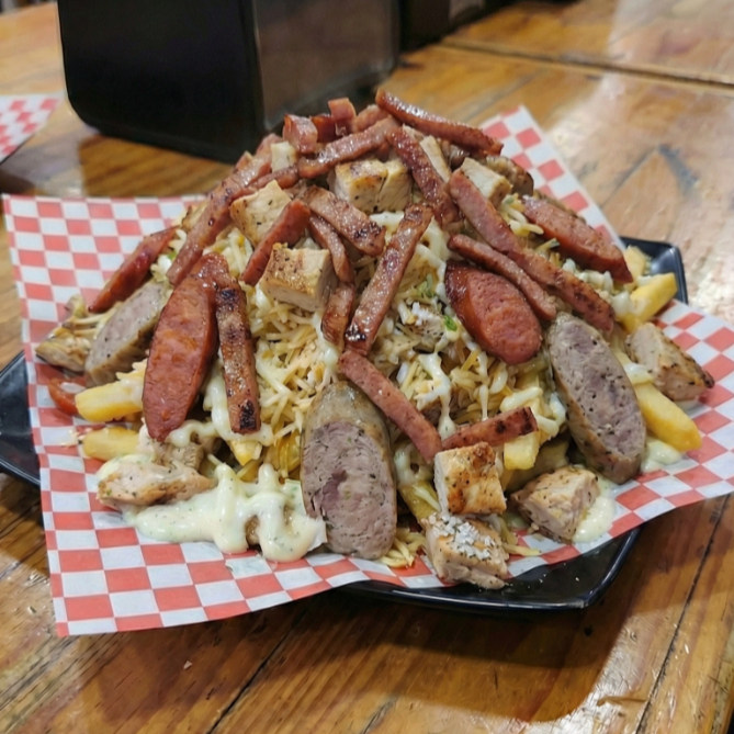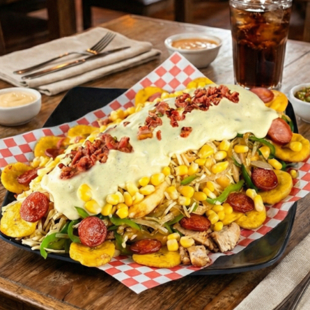 Papas francesas salchicha manguera delichicks pollo salchicha ranchera cebolla y pimentón grille virutas de papa tajadas de plátano verde queso gratinado tocineta