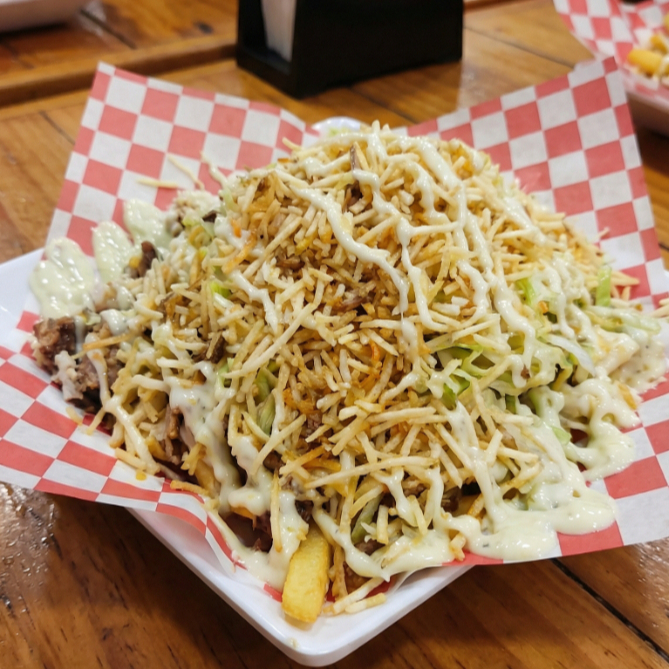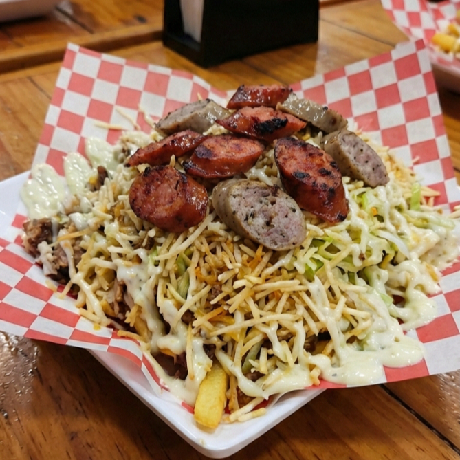 Papas francesas salchicha manguera delichicks queso costeño lechuga virutas de papa chorizo y butifarra