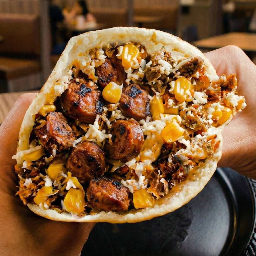 Arepa de maíz rellena con chorizo artesanal, queso costeño, maduritos, maíz dulce, virutas de papa