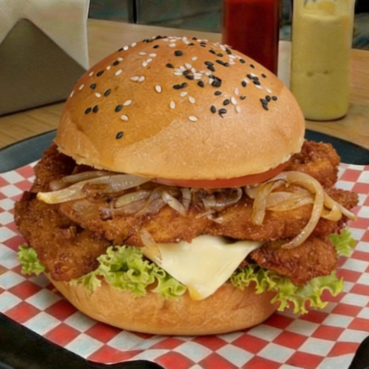Pan de hamburguesa lechuga pechuga de pollo crispy queso mozzarella cebolla sofrita tomate
