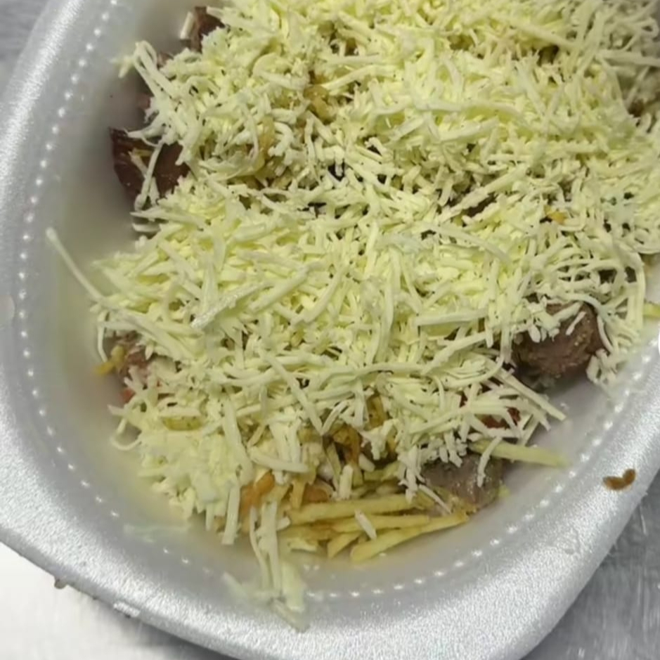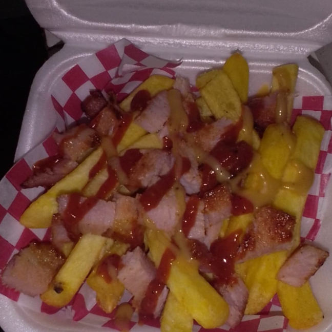 Pan francés, Carne de Cerdo Desmechada, Pechuga de Pollo Desmechada, Tomate, Cebolla, Lechuga, Queso Mozzarella, Salsa DE-LEITE, Papas a la Francesa 120 Gr y Bebida 250 ML
