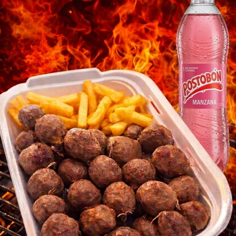10 butifarras al carbón, papas a la francesa, chimichurri, bebida 250ml.