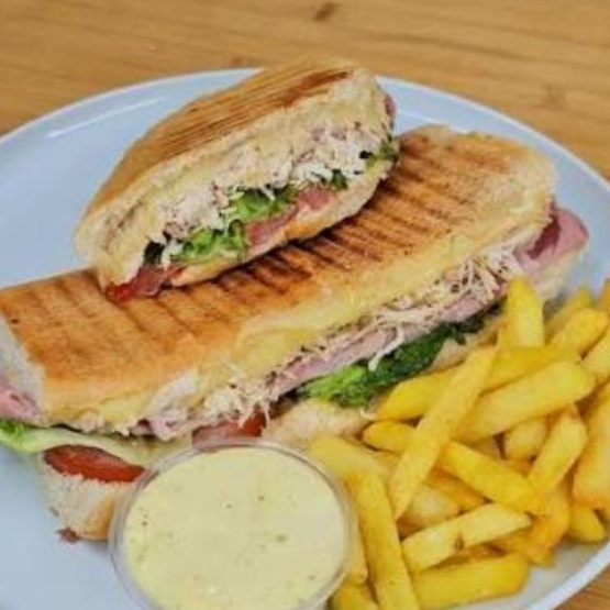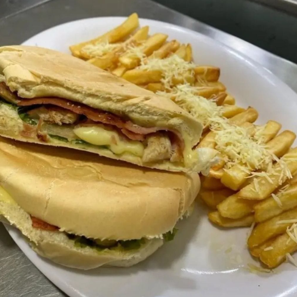 Pan francés, Pechuga Pollo Desmechada, Tomate, Jamón Ahumado, Queso Mozzarella, Lechuga, Salsa de la Casa, Papas a la Francesa 125 Gr y Bebida 250 ML.