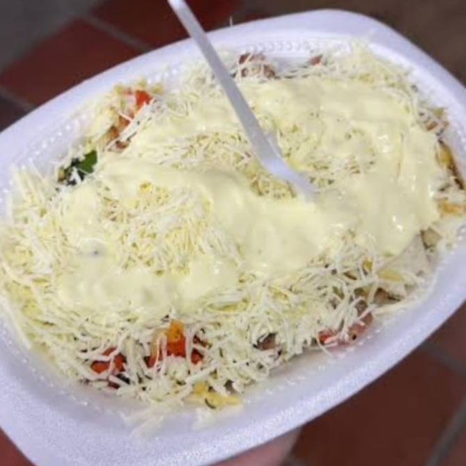 Base de doritos, pollo desmechado, cerdo desmechado, maíz tierno, pico de gallo, queso, tocineta, salsa cheddar, mayochipotle, bebida 250ml
