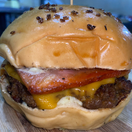 Pan tipo brioche, 100% carne de res artesanal (135 g), acompañada de tocineta, queso cheddar derretido en salsa tártara de la casa.