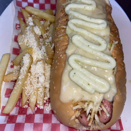 Salchicha de perro, lechuga, queso costeño, papa chongo, jamón, gratinado, maíz y salsa tártara de la casa.