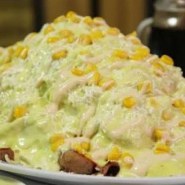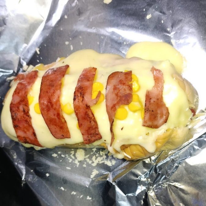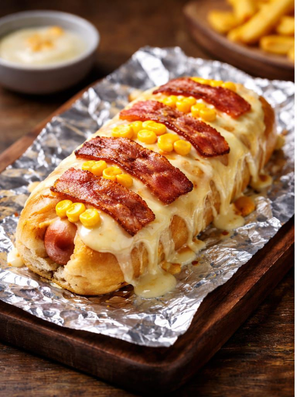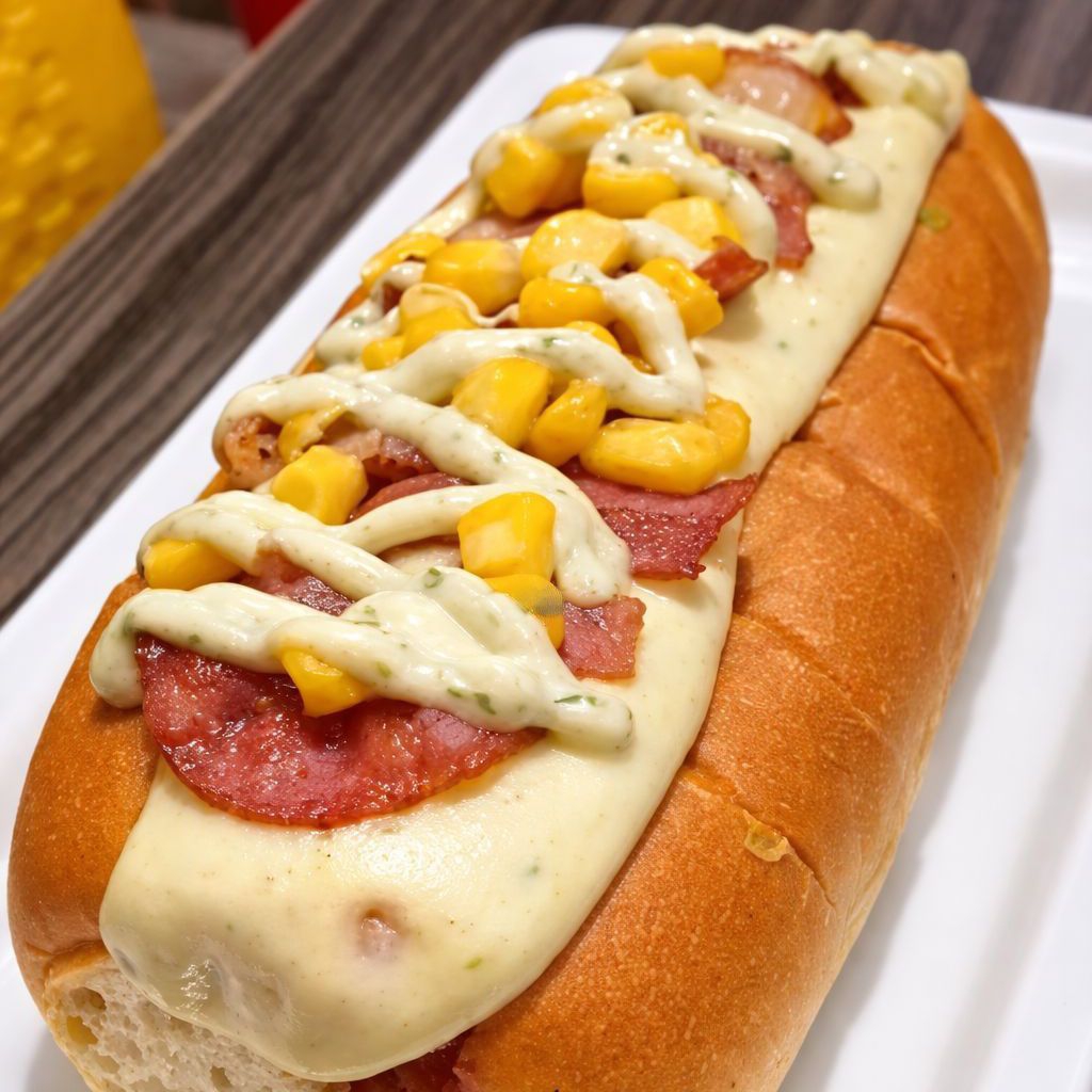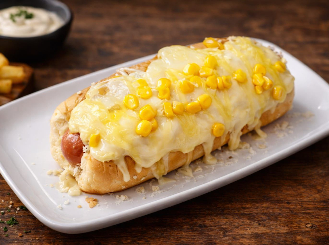 Hot dog cubierto con maíz tierno desgranado y una mezcla de quesos y salsas.