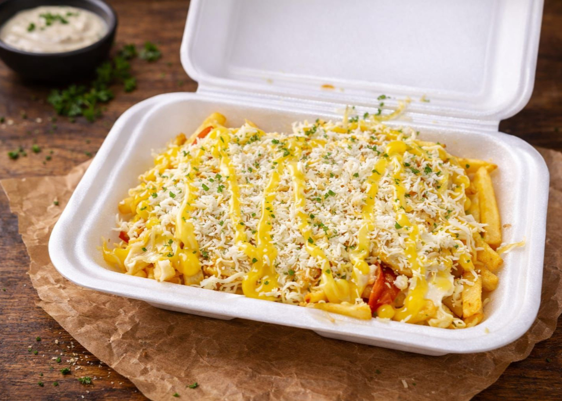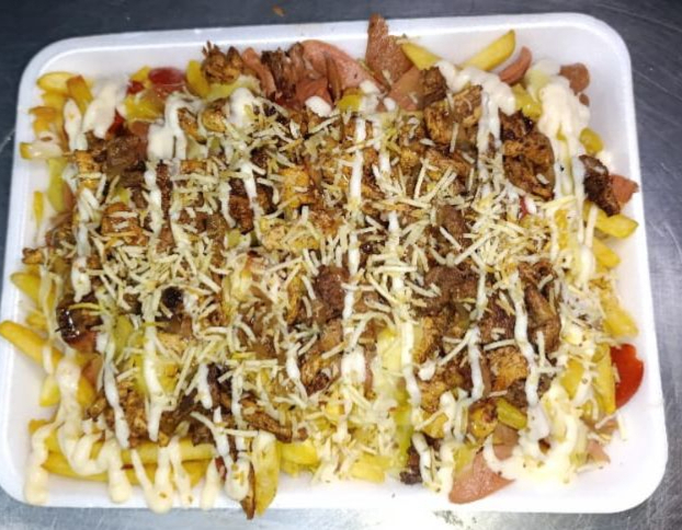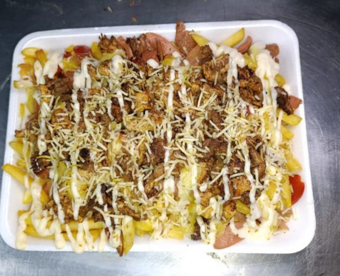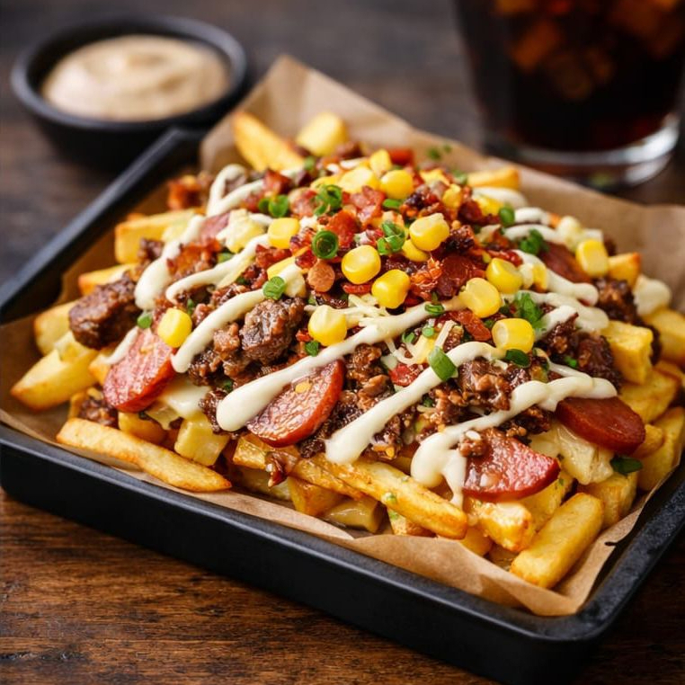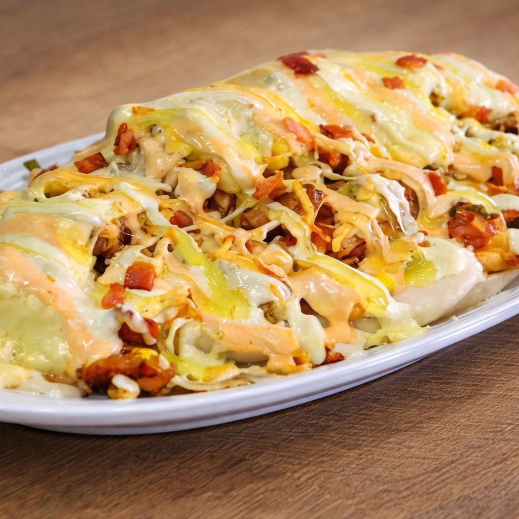 Generosa porción de papas fritas combinada con carnes seleccionadas y aderezos especiales para compartir.