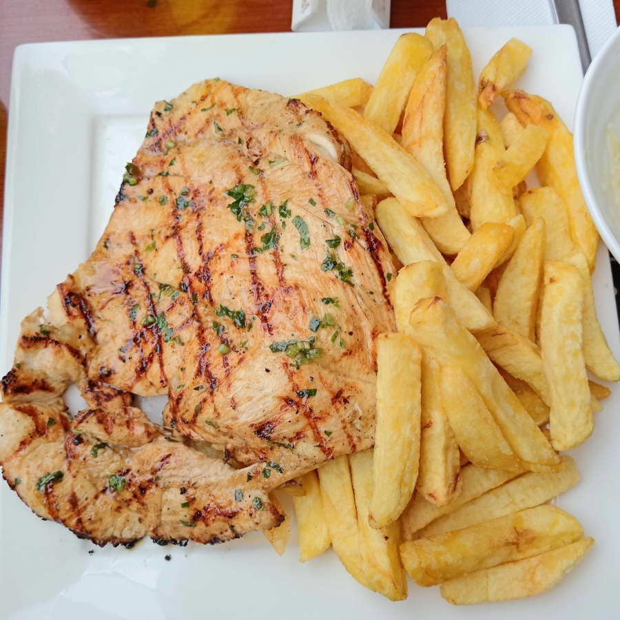 Papas fritas crocantes acompañadas de trozos de pechuga de pollo a la plancha y salchicha.