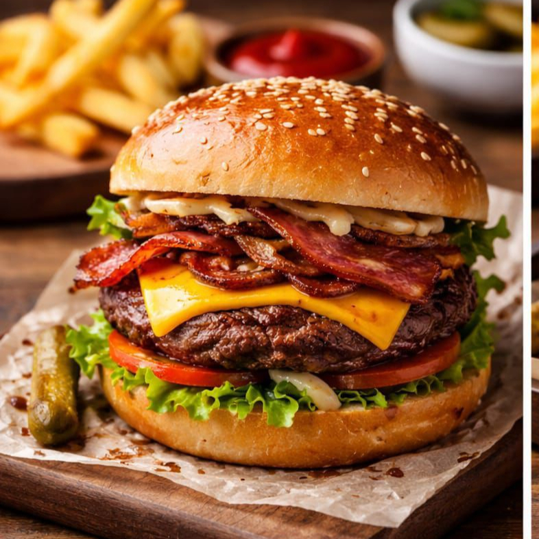 Doble carne de res, doble queso, vegetales y salsas para el gran apetito.
