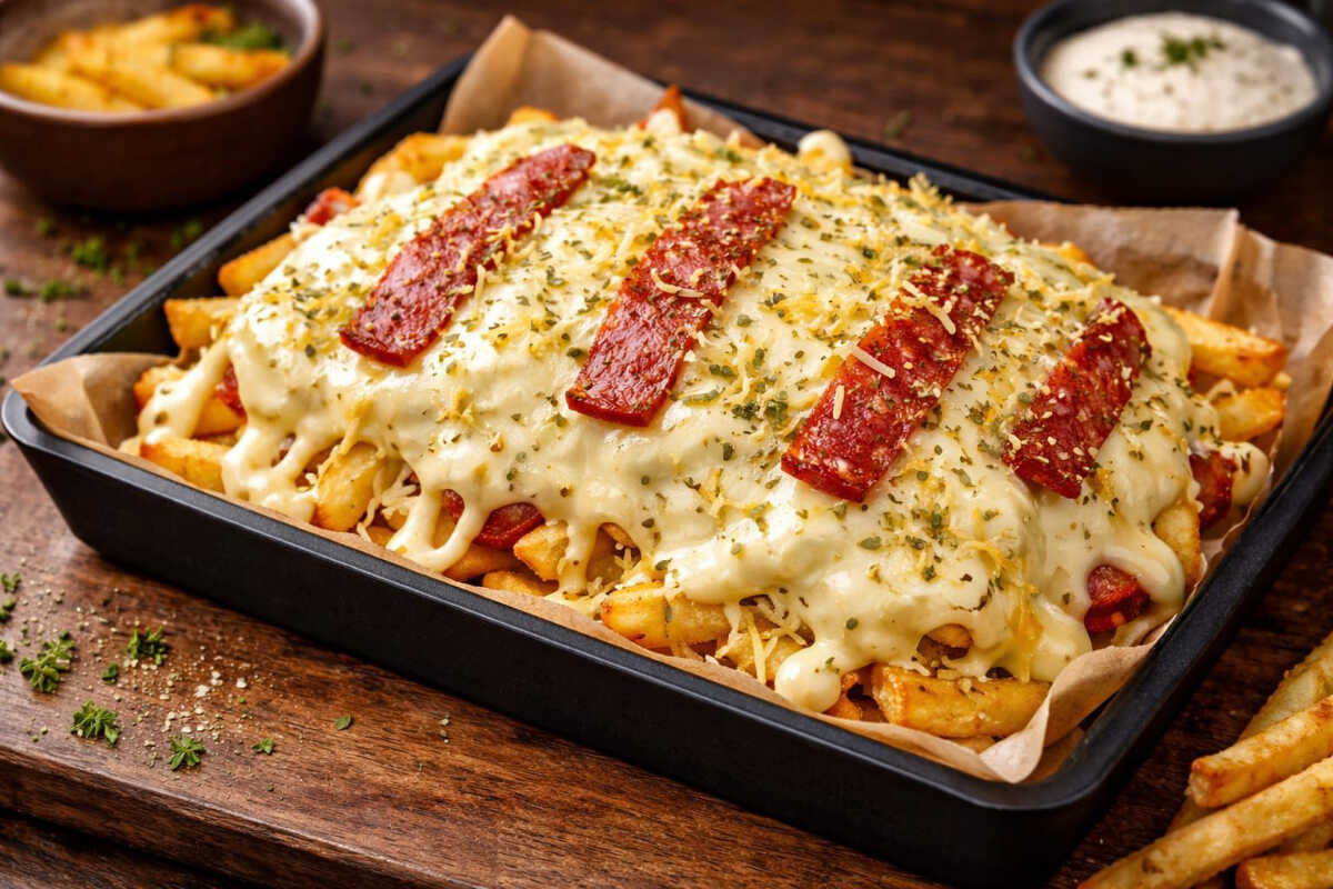 Una porción extra grande de papas fritas con el toque justo de salchicha tradicional.