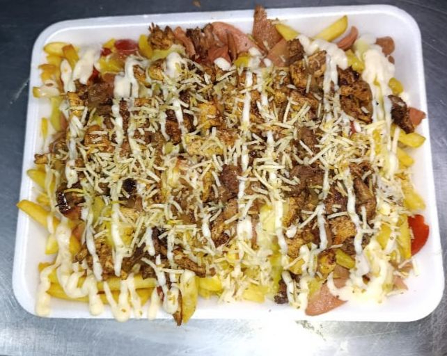 Clásica combinación de papas fritas con salchicha y jugosos trozos de carne de res picada.