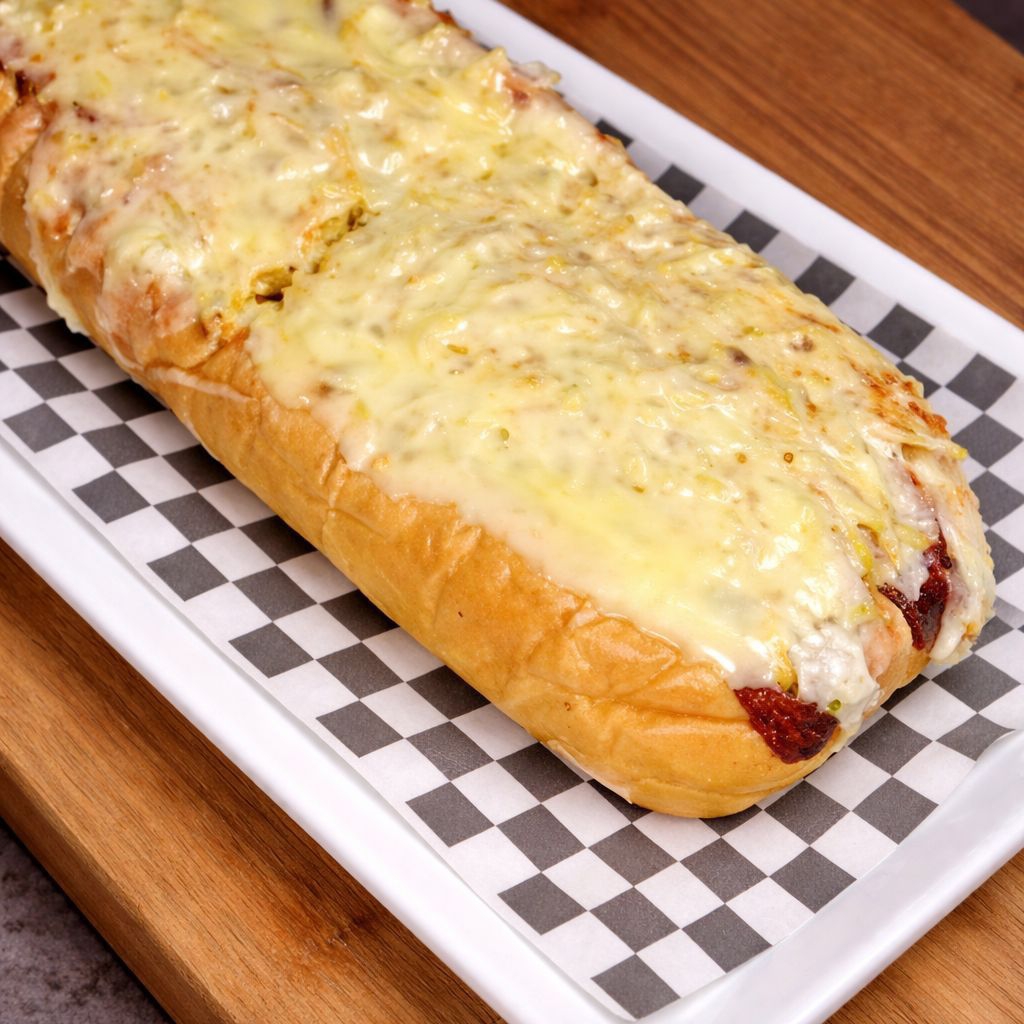 Pechuga a la plancha cubierta con una capa de queso mozzarella fundido.