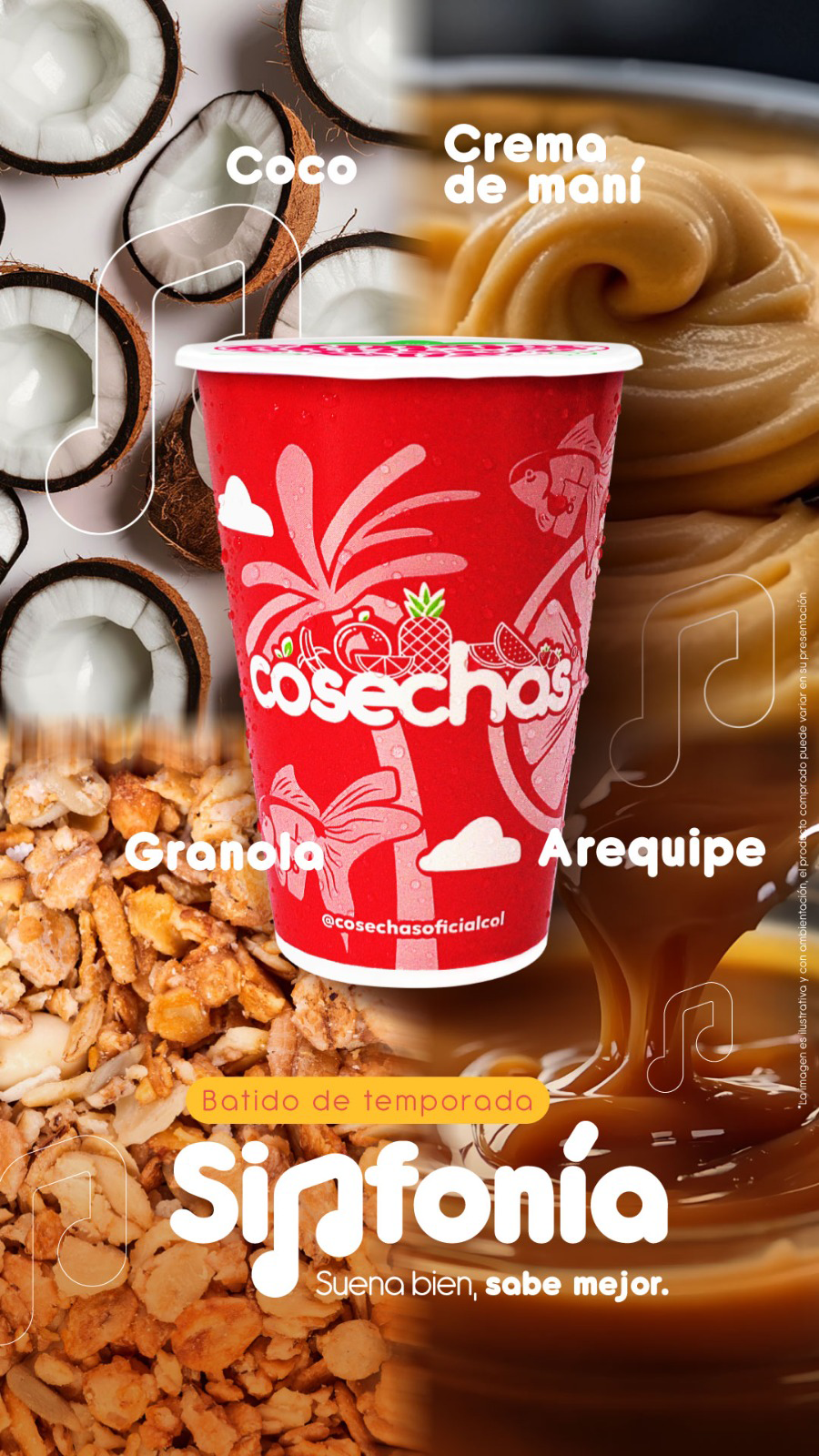 Batido con arequipe, coco, granola y crema de maní, tamaño a elección. nuestras preparaciones se encuentran estandarizadas por lo tanto no se pueden realizar modificaciones en los ingredientes.
