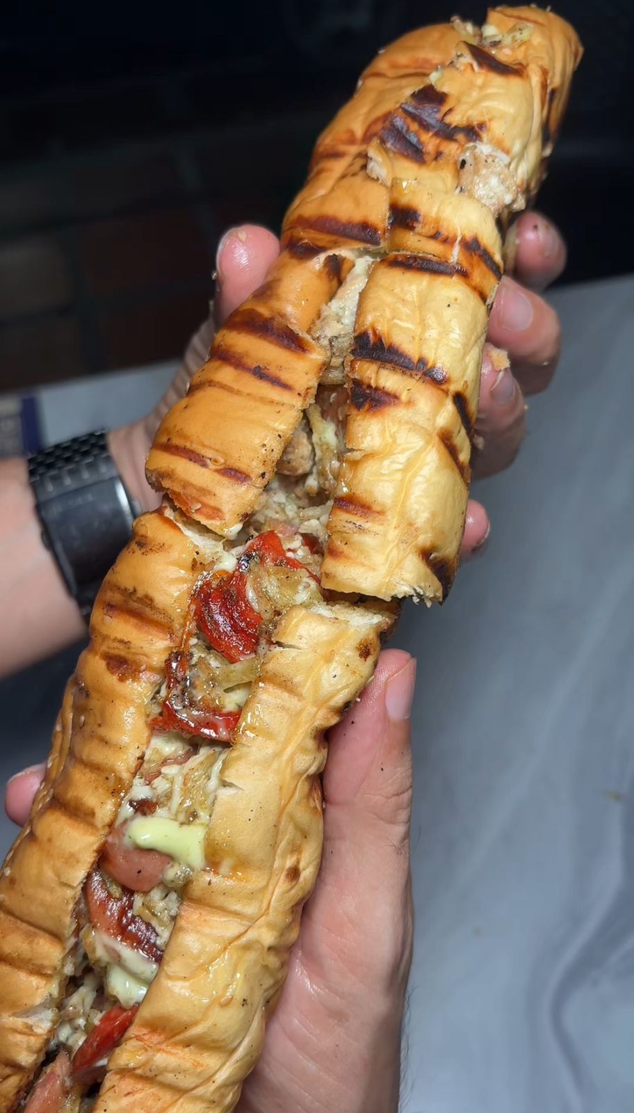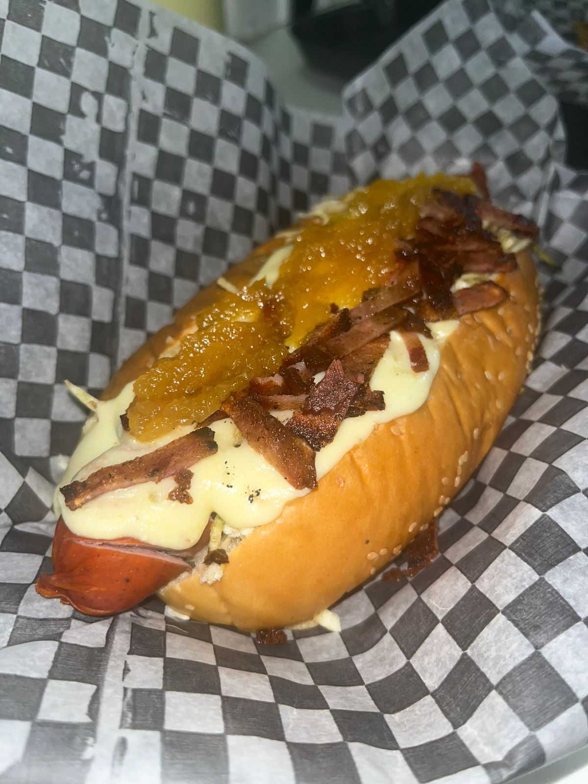 Pan perro, salsa tartara de la casa, chongo, lechuga, queso costeño, salchicha suiza, queso gratinado, mozarella bacon en trozos y piña en trozos.