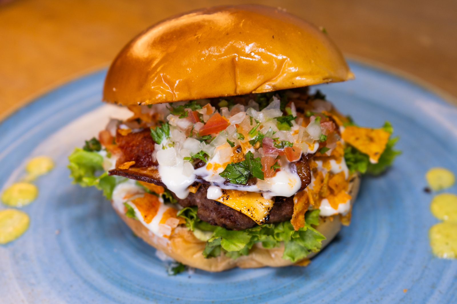Pan brioche hamburguesa, salsa tartara de la casa, lechuga crespa, carne angus, queso cheddar, pico de gallo, doritos triturados, tocineta y suero.