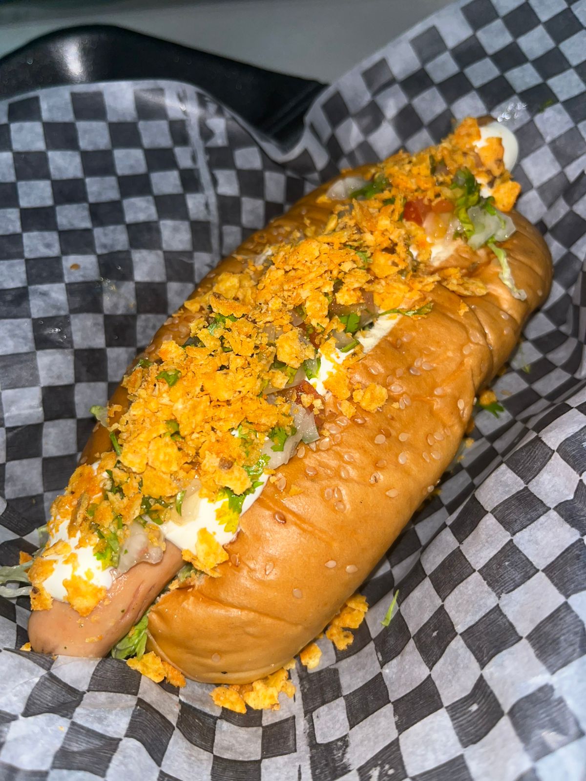 Pan perro,salsa tartara de la casa, queso costeño, salchicha ranchera, suero, pico de gallo y doritos triturados.