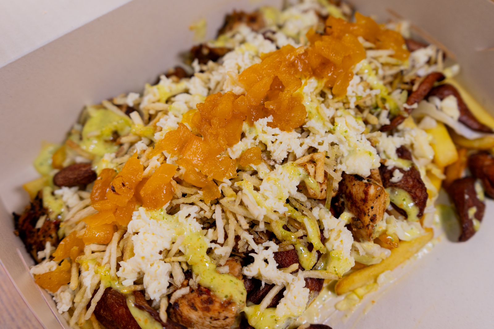 Salsa tartara de la casa, papas, lechuga, salchicha, delichiks, pollo, carne, chorizo, butifarra, salsa tartara, queso costeño, chongo, gratinado con maiz y tocineta crocante trozos de piña.