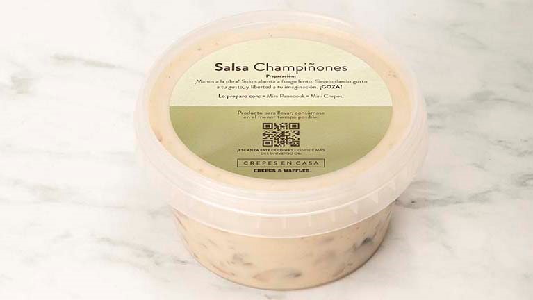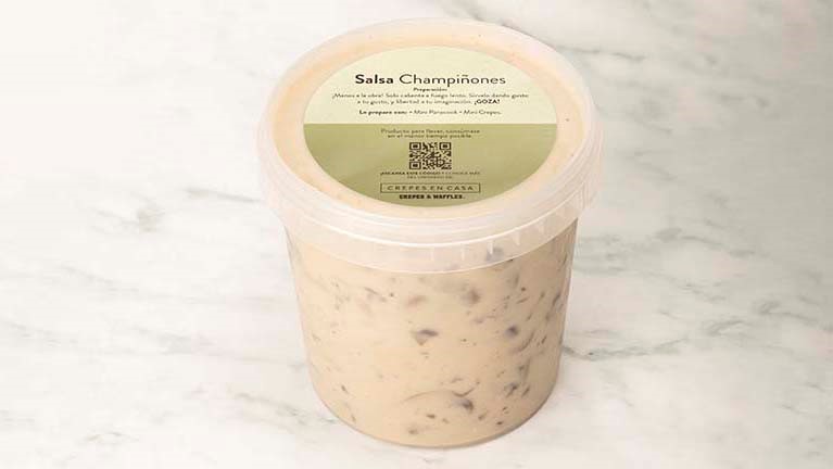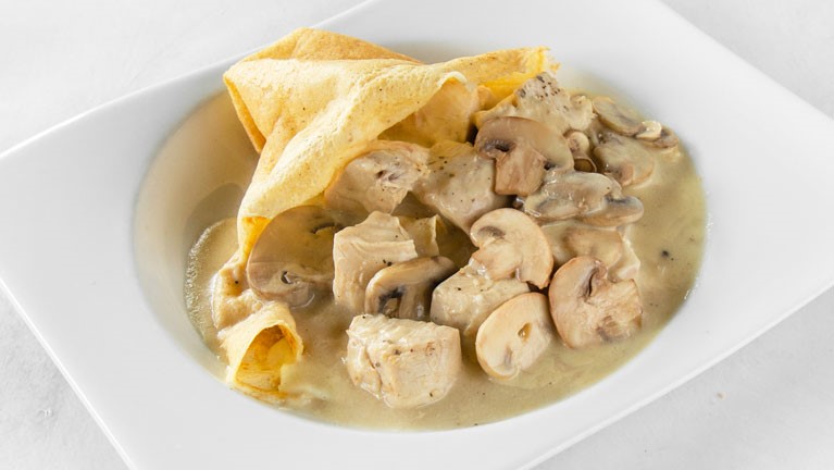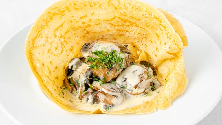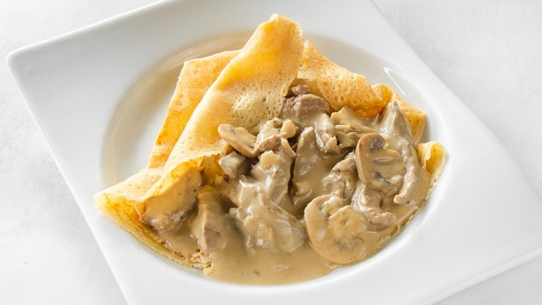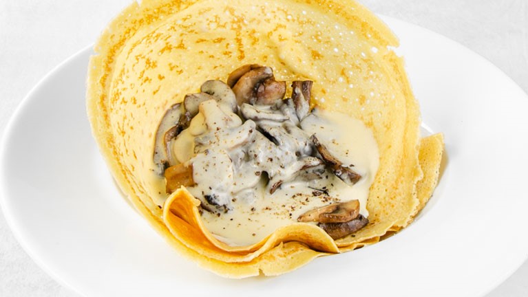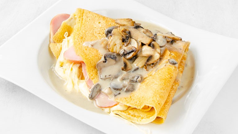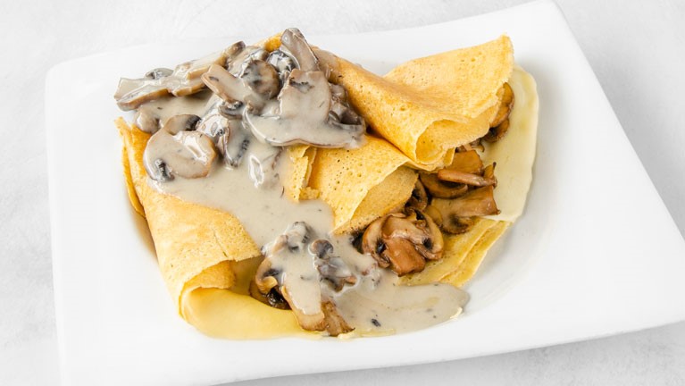 Crepe de champiñones bañados en una clásica salsa de quesos suizos.