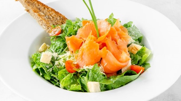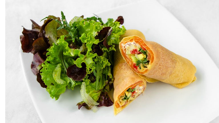 Crepe de salmón ahumado con rúgula, queso crema, cebolla, aguacate y vegetales, acompañados de ensalada verde.