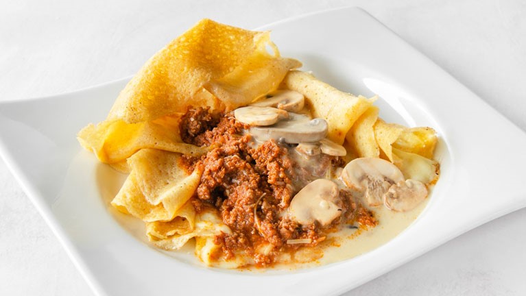 Crepe de boloñesa + queso + champiñón = buena mezcla
