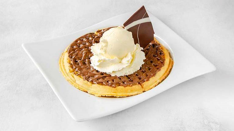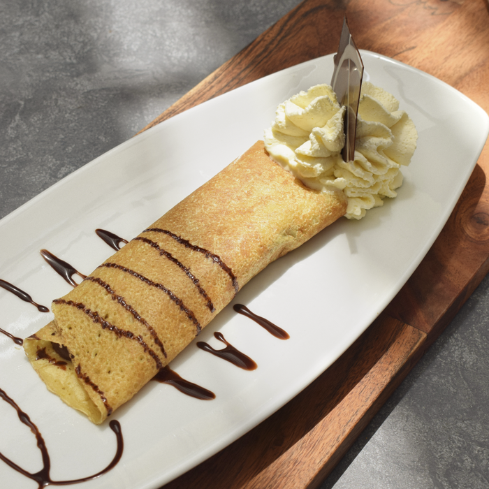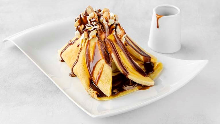 Crepe con banano fresco, helado de Vainilla, nueces, chocolate caliente y crema chantilly.