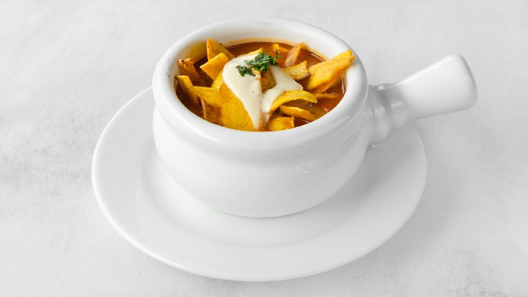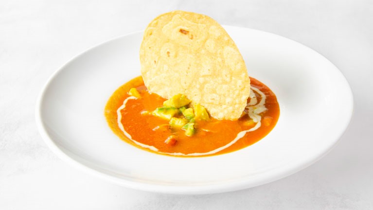 Sopa donde el tomate, el maíz y el plátano entran a jugar para resaltar el valor de los sabores de nuestra tierra, con aguacate, crema agria y cilantro.